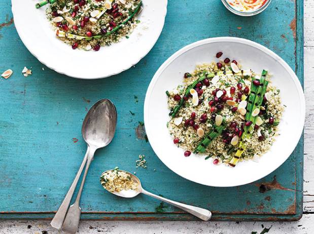 Gently mix in the charred vegetables and season with salt and pepper. Scatter over the pomegranate seeds, parsley and toasted, flaked almonds and serve in a large bowl.