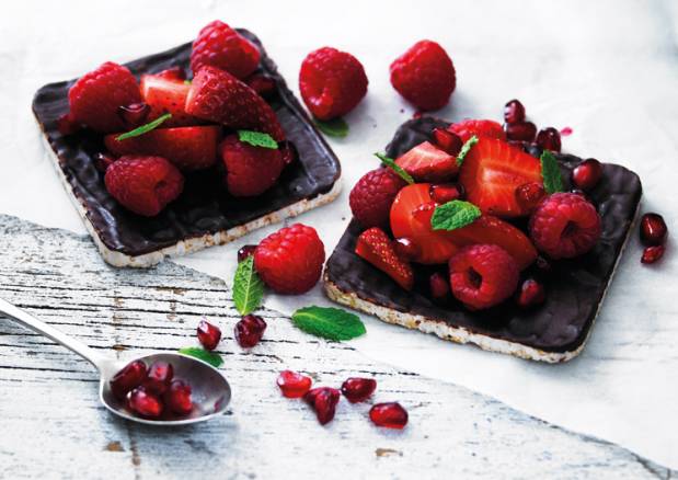 Our dark chocolate rice cake thins make a perfect evening treat with a mixture of sweet berries, a drizzle of honey and a refreshing sprinkle of mint.