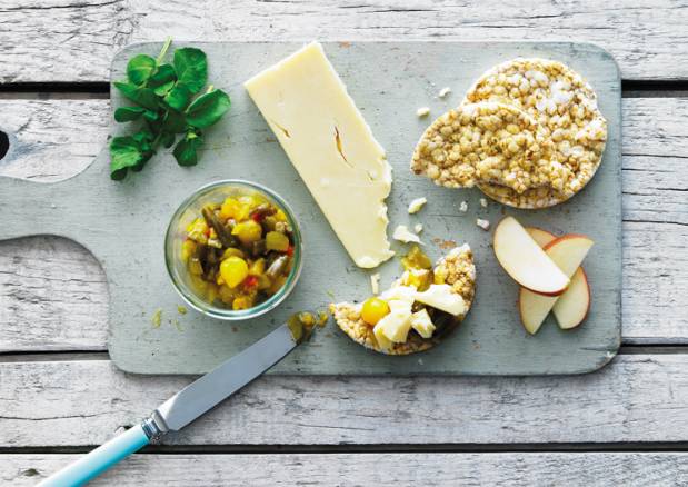 Create a wonderfully scrummy rice cake platter by chopping up slices of your favourite cheese, adding some cut up apple and a pot of piccalilli. Perfect to share with a few friends at lunchtime!